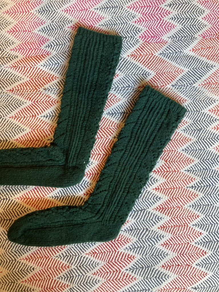 すずらんのような透かし模様を編み込んだ靴下です。ボディー部分を長めに編んでいますのでハイソックスとして履いていただいてもよいですが、くしゅっとさせてレッグウォーマー+靴下のイメージで履いていただいても可愛いかと。ボディー部分はお好みで短くしていただいてもよいですね。